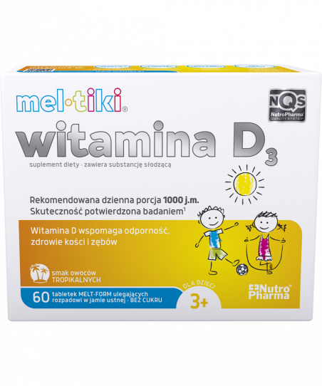 Dwie tabletki meltiki®witamina D zapewniają dawkę 1000 j.m. witaminy D. Jest to ilość spełniająca najnowsze rekomendacje dla dzieci i młodzieży do 18 r.ż.1 Badanie z udziałem polskich dzieci w wieku 4 lat wykazało, że aż 99% z nich miało przewlekłe niedobory pokarmowe witaminy D w diecie2.Dlatego dodatkowe przyjmowanie preparatów zawierających witaminę D zmniejsza ryzyko jej niedoboróww organizmie dziecka. Jest to szczególnie istotne podczas krytycznego okresu wzrastania i kształtowania się jego układu kostnego.