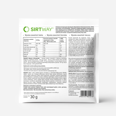 Osoby chore, stosujące leki, mające nadwrażliwość na składniki SIRT koktajlu, powinny przed spożyciem skontaktować się z lekarzem. Nie stosować jako jedyne źródło pożywienia. Produkt nie stanowi zamiennika posiłku, kompletnej ani niekompletnej żywności specjalnego przeznaczenia medycznego, stosowanej w celu redukcji masy ciała.